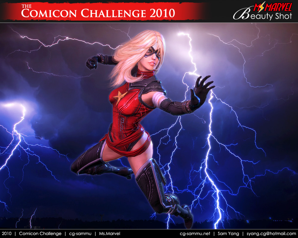 -I made sure my entry for this year's Comicon Challenge wasn't just another Wolverine or the 6th Batman entry.. I realized nobody picked Ms. Marvel and I thought it would be a great choice for the sake of originality. While creating Ms. Marvel, I wanted it keep the same design, but with a slight change in the costume process so it's got a new unique twist. Some of the things I prioritize when it comes to female characters are her face, skin, pose and lighting. I used 3dsMax for modeling, ZBrush for the high resolution detailing, Photoshop for the textures, and Marmoset engine for the final render for this competition. In the end, I received 10th place out of like 300 entries i think - which is fantastic! :D I'm very happy about it.